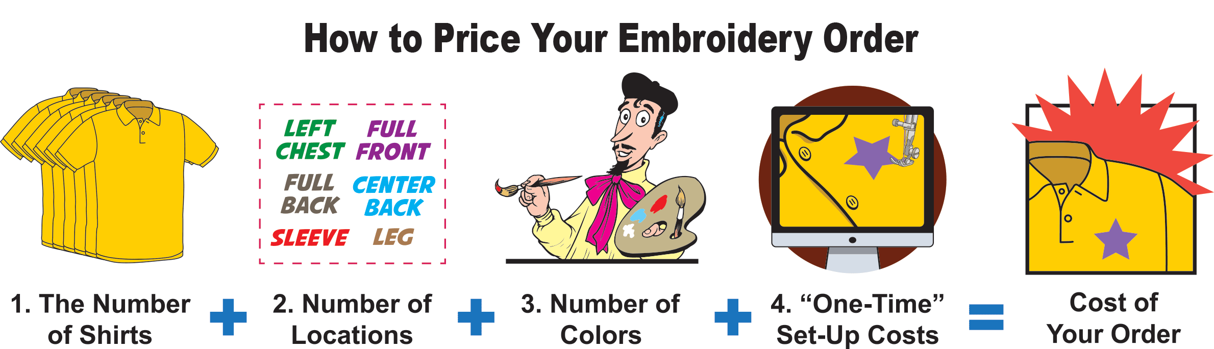 Pricing & Garment Minimums: There is charge for orders that do not meet the minimum requirements for an embroidery run. For additional information, Click here for our Embroidery Pricing Chart. |