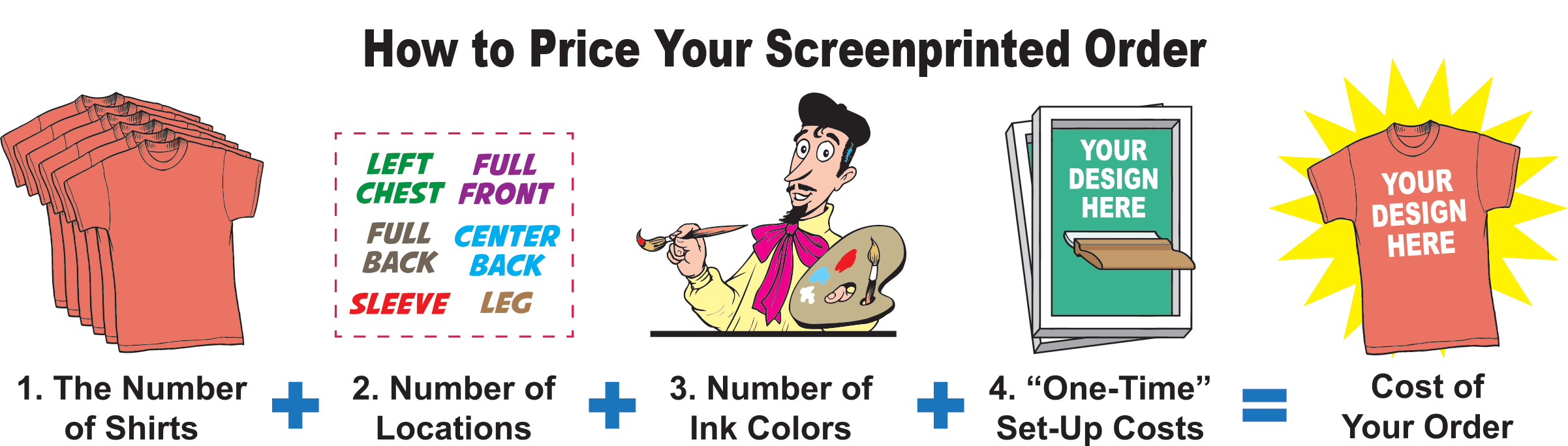 Pricing & Garment Minimums: There is charge for orders that do not meet the minimum requirements for a screening run. For additional information, Click here for our Screen Imprint Chart. |